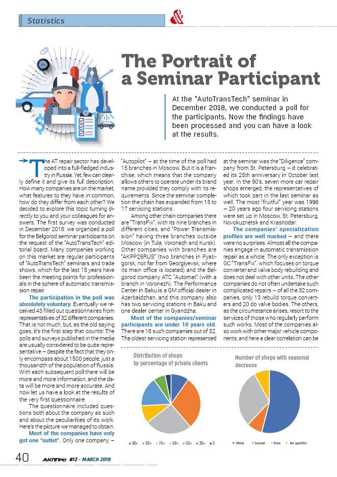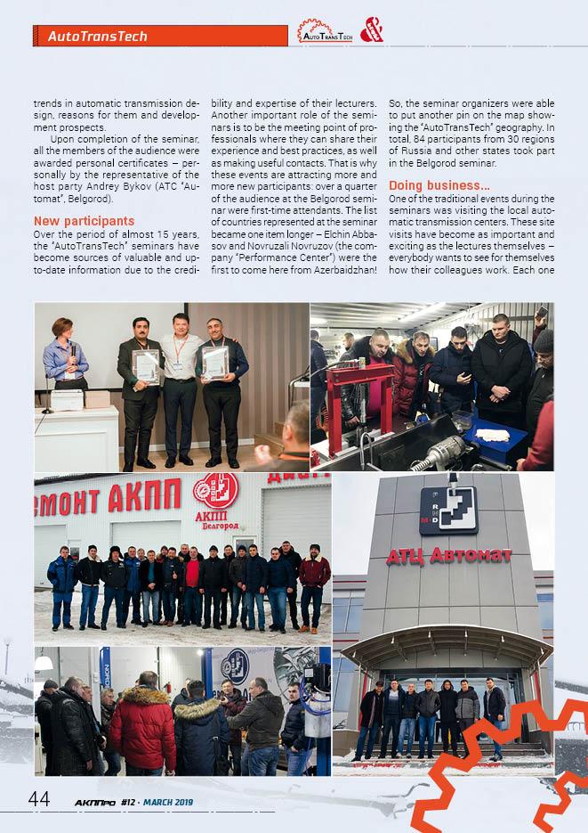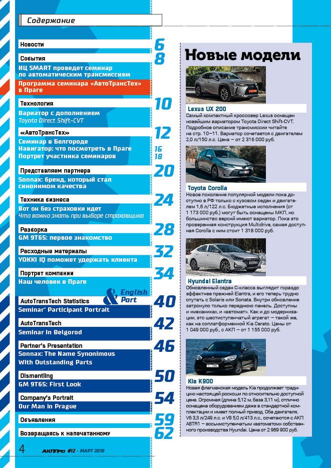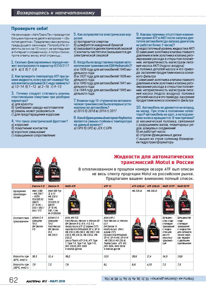 Toyota was the first to release the Direct Chift-CVT, where the traditional gear drive had been added to the CVT. Igor Yemelyanov from Novokuznetsk shares his impressions of a new automatic transmission – GM 9T65. It’s the first time we have tried to question the seminar participants about the peculiarities of their trade, and we are now publishing the overview of the poll results. Besides, in this issue you will learn about the work of the leading AT components manufacturer – Sonnax, and, following our ATF overview in the last issue, about the transmission fluids YOKKI IQ and Motul. Enjoy the reading!