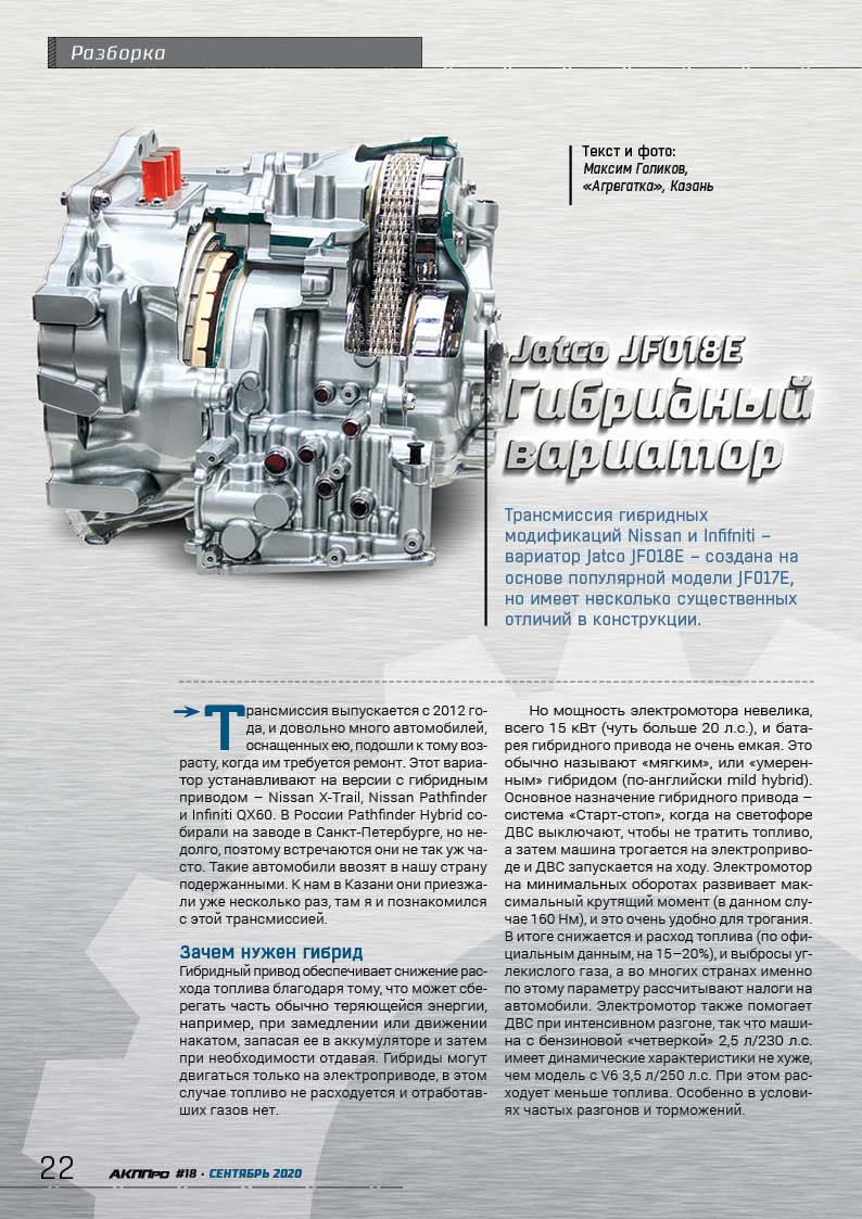 The transmission of Nissan and Infifniti hybrid modifications - the Jatco JF018E CVT is created on the basis of the popular JF017E model, but has several significant design differences.