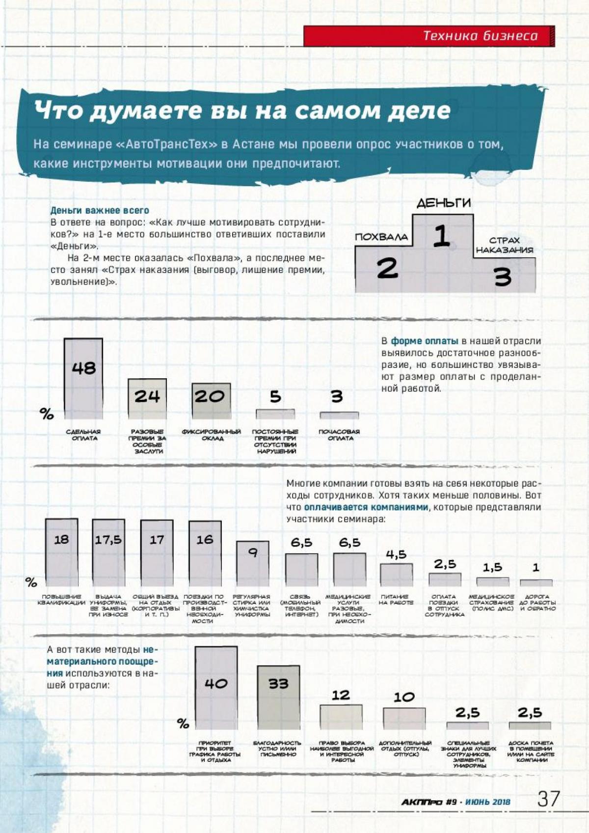 The warmest time of the year for some people spells vacation time, whereas for others it’s the high season. Automobiles are used more often in the summer, so, naturally, there’s more need for professional advice. This is exactly when the problem of personnel efficiency looms large at a car service center. It happens so because employees eventually have to work more in the summertime. What can be done to make the staff take the increased load of work in the right spirit? The first thing that comes to mind is a pay rise. According to the poll conducted among the participants of the “AutoTransTech” seminar in Astana, many consider money to be the best motivation. However, the coach-consultant Natalia Lobanova in her article on motivation reminds us that money is by far not the key incentive. The title of the article reflects its main idea: “Don’t get obsessed with the salary!”