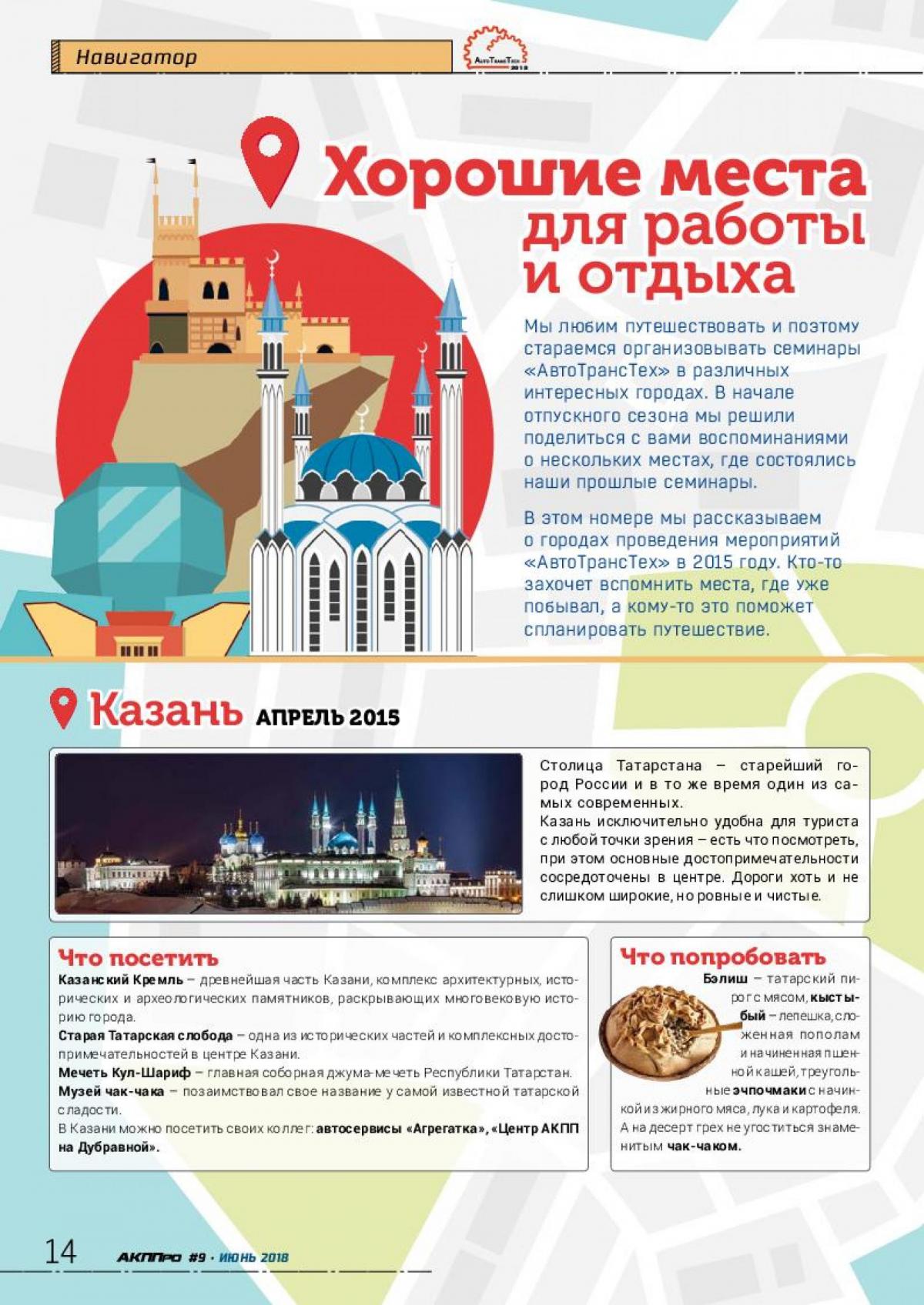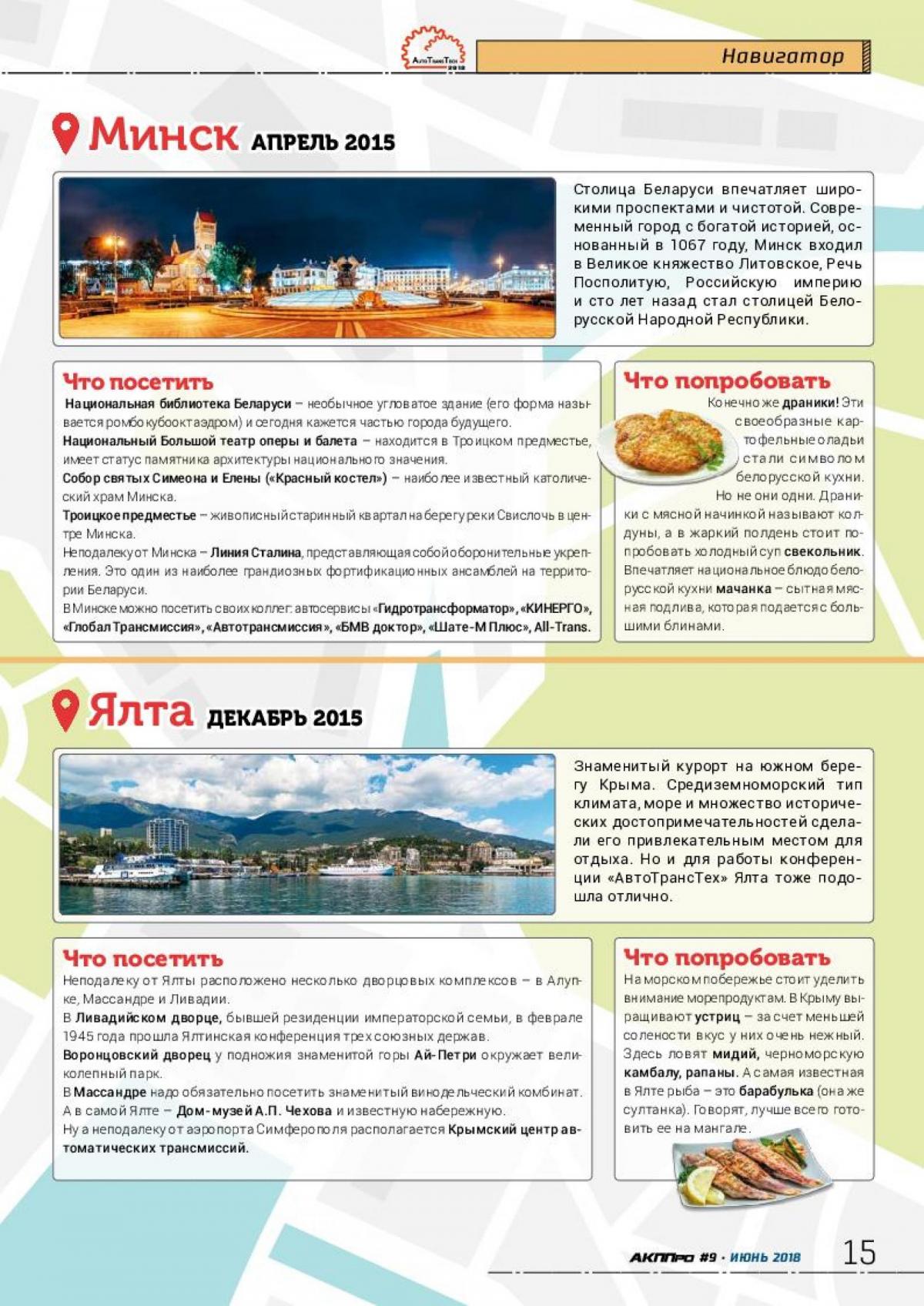In the modern world, almost everyone can earn a living and is able to buy food, clothes and pay for the housing. So, nowadays, other needs are coming into the picture – recognition, respect, the opportunity to improve the world, to produce an influence on other people. Look how much is being done for free these days! People take part in various events as volunteers. If a job provides an opportunity for the employees to participate in something big and useful, changing the world for the better, it will produce the same effect on them as a cash bonus. As they say, when your work brings you pleasure, it does not seem so hard after all. How to achieve this result is described in one of the centerpieces of the current issue – “ Not by bread alone”. And since summer has set in already, we have decided to touch upon the topic of vacation. We reminisce about the cities where “AutoTransTech” seminars took place in 2015. Minsk, Kazan and Yalta were not chosen by chance then – those who visited these cities know how suitable they are not only for work-related meetings but also for recreation and new experiences.