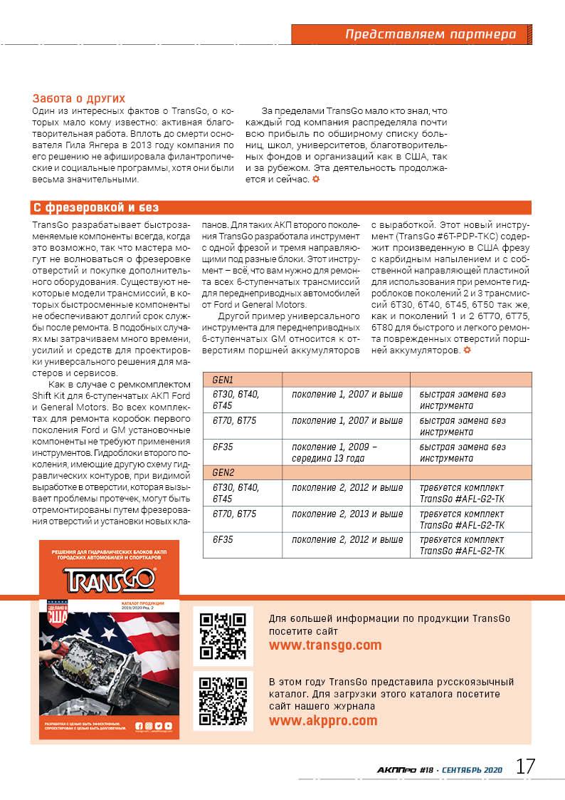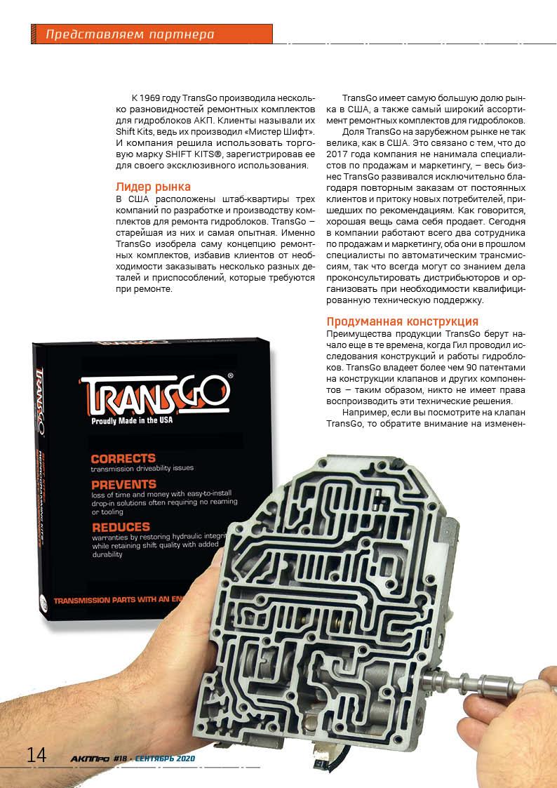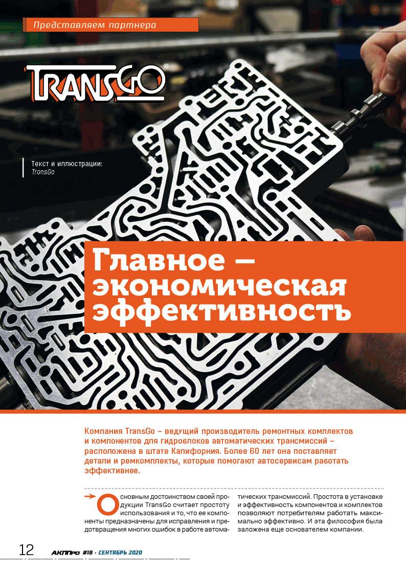 стр. 6 ТехнологияКомпания TransGo – ведущий производитель ремонтных комплектов и компонентов для гидроблоков автоматических трансмиссий – расположена в штате Калифорния. Более 60 лет компания поставляет детали и ремкомплекты, которые помогают автосервисам работать эффективнее.