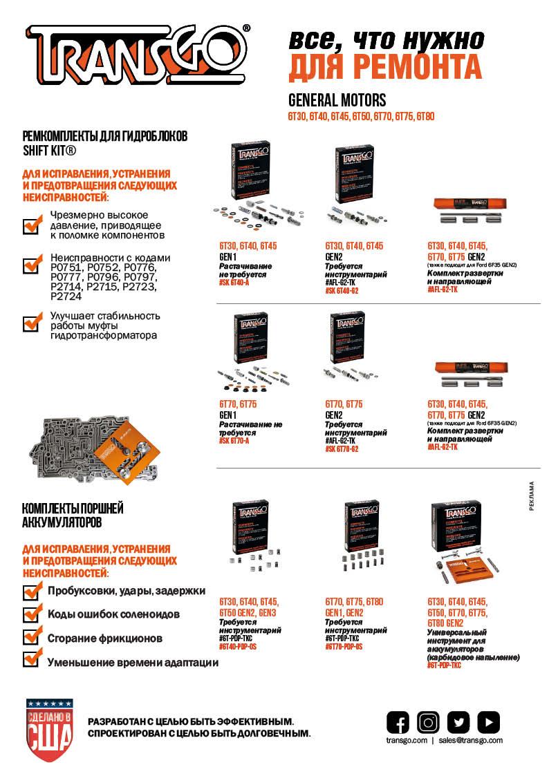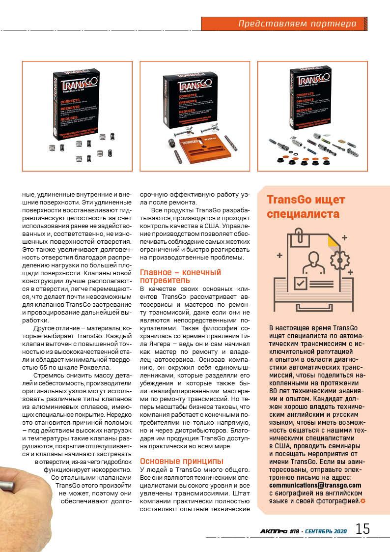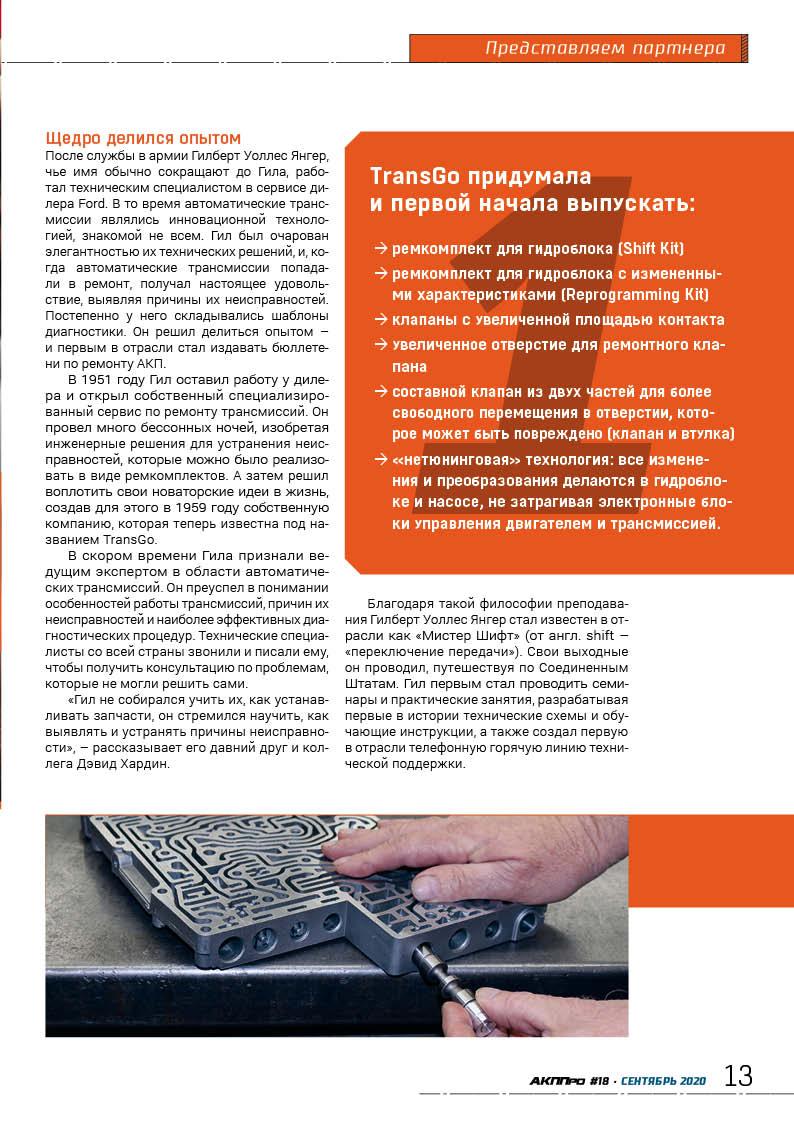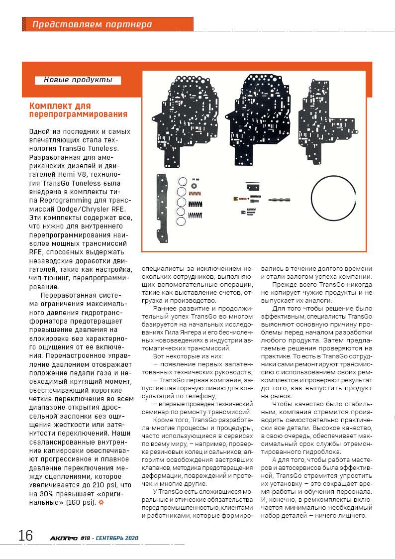 стр. 6 ТехнологияКомпания TransGo – ведущий производитель ремонтных комплектов и компонентов для гидроблоков автоматических трансмиссий – расположена в штате Калифорния. Более 60 лет компания поставляет детали и ремкомплекты, которые помогают автосервисам работать эффективнее.