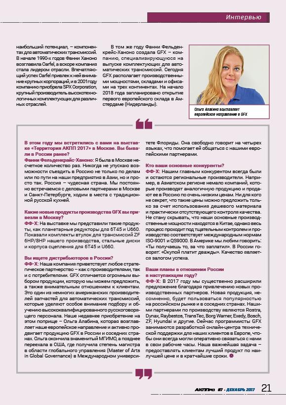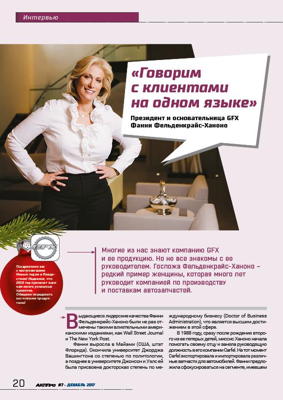 стр. 18 АвтоТрансТехМногие из нас знают компанию GFX и ее продукцию. Но не все знакомы с ее руководителем. Госпожа Фельденкрайс-Ханоно – редкий пример женщины, которая много лет руководит компанией по производству и поставкам автозапчастей.