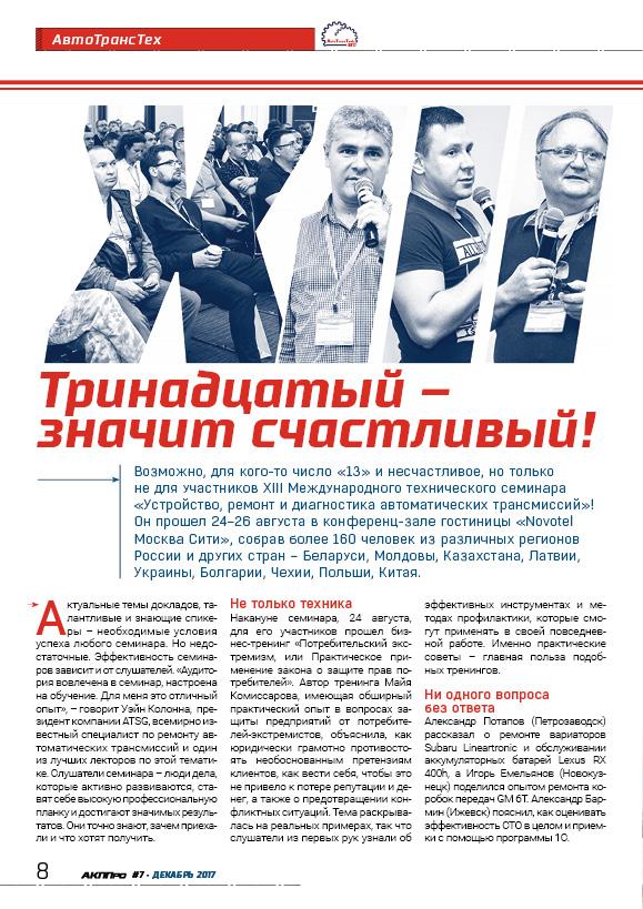 Возможно, для кого-то число «13» и несчастливое, но только не для участников XIII Международного технического семинара «Устройство, ремонт и диагностика автоматических трансмиссий»! Он прошел 24– 26 августа в конференц-зале гостиницы «Novotel Москва Сити», собрав более 160 человек из различных регионов России и других стран – Беларуси, Молдовы, Казахстана, Латвии, Украины, Болгарии, Чехии, Польши, Китая.