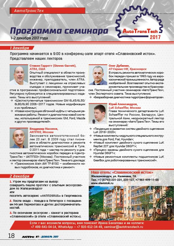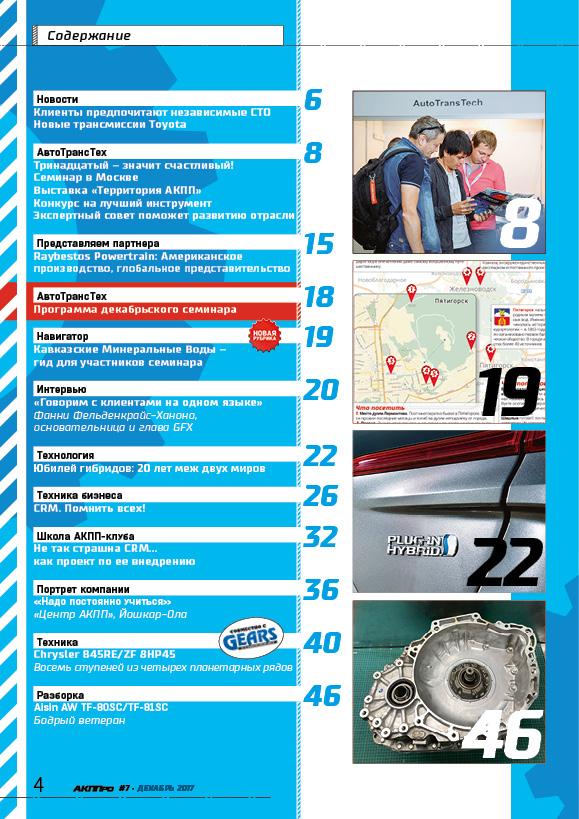 В декабрьском номере журнала мы рассказываем о важнейших событиях для отрасли в уходящем году: международной выставке «Территория АКПП» в Москве (стр. 10), конкурсе на лучший инструмент (стр. 12), создании Экспертного совета и его планах (стр. 14). И, конечно, о прошедшем в августе семинаре «АвтоТрансТех» на стр. 8.