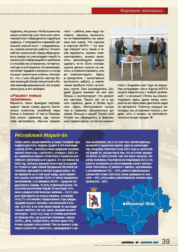 стр. 32 Школа АКПП-клубаИстория компании «Центр АКПП» из Йошкар-Олы как нельзя лучше подходит для новогоднего номера. Рассказ о том, как терпение, труд и настойчивость в достижении своей цели помогают достичь небывалых высот, типичен для рождественских сказок. Но в нашем случае это вовсе не сказка, а настоящая быль.